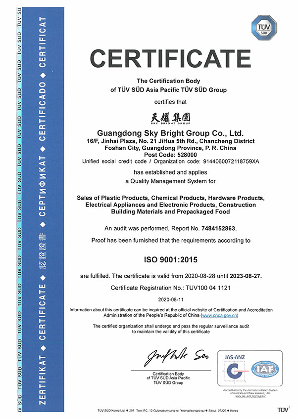Sky Bright Group continues to enlarge its technical team and established professional laboratories including Infrared Laboratory, Mechanical Strength Laboratory, Physics Laboratory, Chemistry Laboratory, Odor Test Laboratory, Weather-Proof Test Laboratory, etc. We have provided the lab data for films, sheets, compounds, pipes, foaming products and many other products.